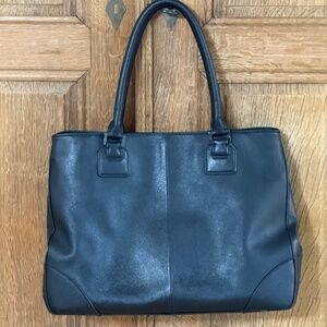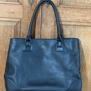 Classic and timeless Tory Burch tote crafted from durable saffiano leather with subtle black hardware and a structured silhouette. Features the signature Tory Burch logo emblem, double top handles, and a spacious interior with multiple compartments for organization.