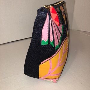 Bright leather leaf appliqués accent the front of this mesh Tory Burch cosmetic pouch. Top zip opens to a logo-lined, 1-pocket interior.