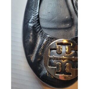 Tory Burch Leather Ballet Flats Womens Size 7.5 Silver Medallion Black Slip Ons