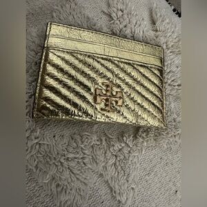 Tory Burch Leather Kira Moto Quilt Metallic Pave Logo Card Case Wallet Gold