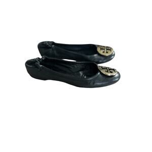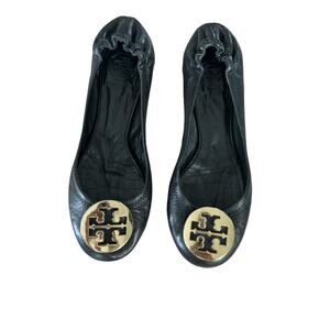 Tory Burch Leather Minnie Ballet Travel Flats in Perfect Black/Gold Size 7.5