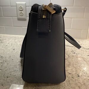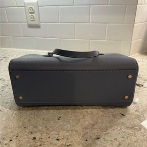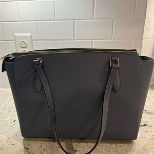 This Tory Burch Leather Tote is stunning. Its smokey blue leather with beautiful gold-toned accents makes it perfect for fall! Comes with a removable cross-body strap. Only carried a handful of times. 14.5 in X 9 in