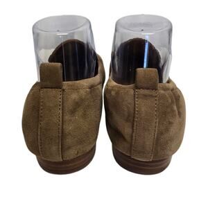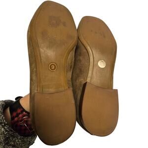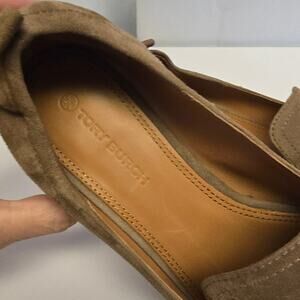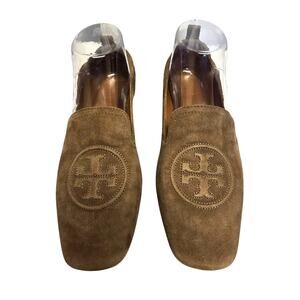 Keywords: designer suede loafers, Tory Burch size 9, preppy slip-on shoes, tan leather flats, women’s designer work shoes, quiet luxury loafers, elastic back heel shoes, classic logo footwear, luxury everyday flats, comfortable travel shoes.