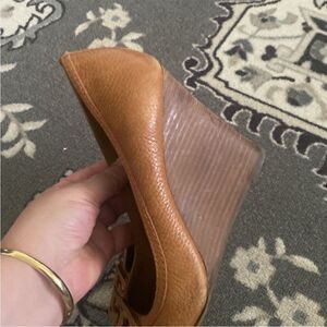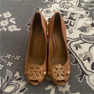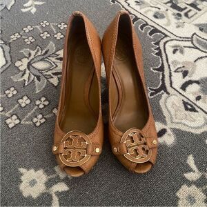 Tory Burch Leticia Open Toe Wood Wedge Tan Leather Pumps 4" Size 9.5