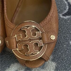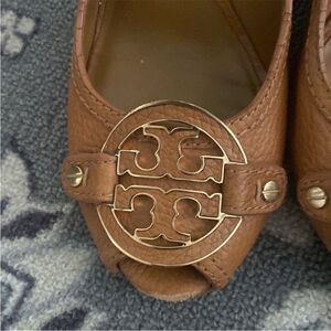 Chic Tory Burch peep-toe heels in tan leather. Features signature logo detail. Ideal for stylish outings.