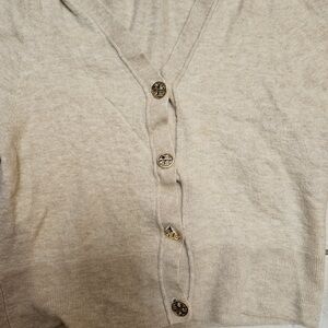 Chic Tory Burch cardigan in light tan. Features button-up front. Ideal for layering. No tags inside for material. Has been washed, but due to material, it has shrunk. The size is large but I think is more like a medium small