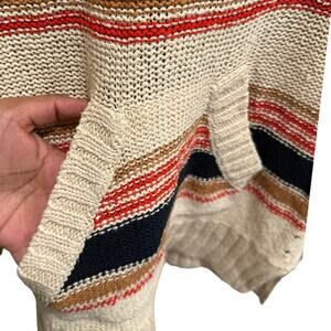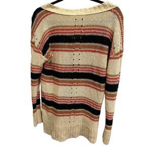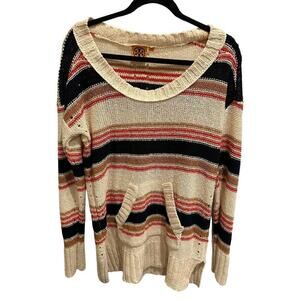 Oversized Tory Burch linen blend sweater in a cream color with red, brown and black stripes. Excellent condition. Size small. Front two hand pocket in the center. Small cutouts pattern throughout back and sides. Perfect piece for layering!
