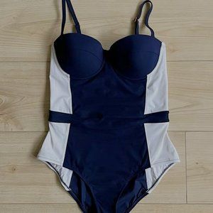 Blue and white hues style a color-blocked one-piece with molded underwire balconette cups featuring flexible side stays that provide additional support in sea and on sand.