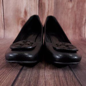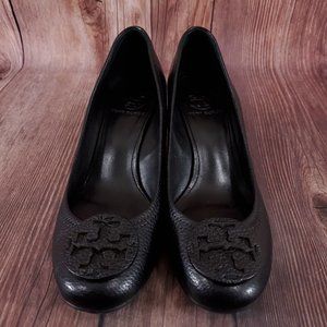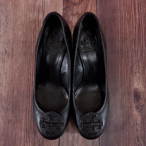 Elegant black wedges with signature Tory Burch logo. Perfect for any occasion.