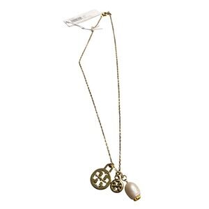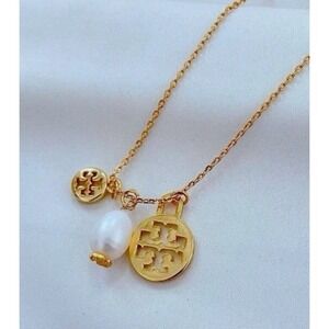 Keywords: Tory Burch necklace, logo pendant, pearl accent, gold tone, designer jewelry, charm necklace, Double T logo, elegant, classic, dainty, gift, fashion jewelry