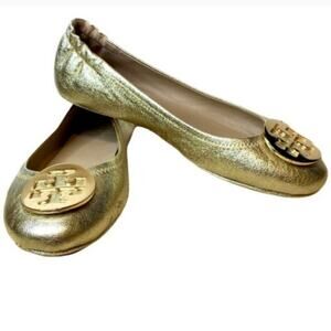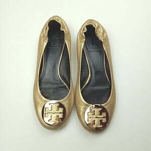 Tory Burch Logo Spark Gold Leather Minnie Travel Ballet Flats Size 5.5M