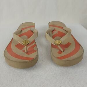 Tory Burch Logo thong wedge slip on sandal Size 8 orange and tan Casual