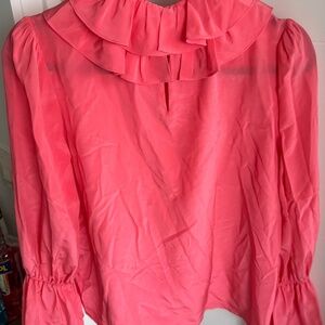 Upgrade your wardrobe with this stunning Tory Burch blouse. Made from luxurious silk, the vibrant pink color and ruffle detail add a touch of elegance to any outfit. The long-sleeve, size 8 blouse fits regularly and works for any occasion—perfect with jeans or a skirt or in the office. Add this versatile piece for effortless style and comfort.
