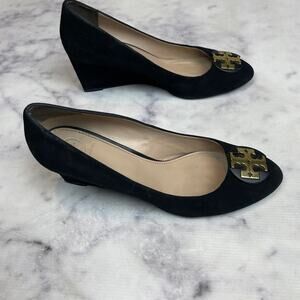 black suede Luna Wedge Pumps with gold colored medallion logo from Tory Burch. suede leather upper and leather lining with rubber sole. approx 2.5” covered wedge heel. GUC to VGUC - with just a few light scuffs and rubbing on upper and wedge heel. light darkening / color transfer on inside lining at back of heel.