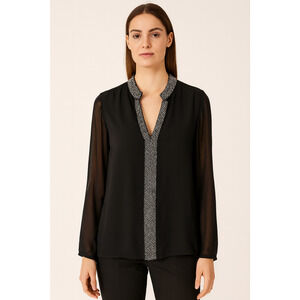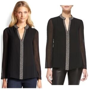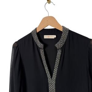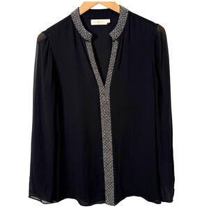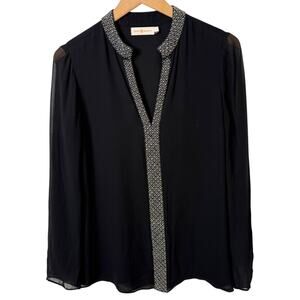 Tory Burch Lynn Embellished Beaded Silk Tunic Blouse Split V Neck Black Size 4