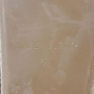 Wedge wrapped in Jute that is very good condition. Rubber Sole with some dirt/signs of wear. Shiny Gold Colored Logo. Made in Spain.