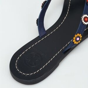 Tory Burch Marguerite Terra Leather Flip Flop Sandals in Navy Flowers. In good used condition. Minor wear. Scuff on one toe and two marks on the foot box.