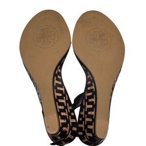 Tory Burch Marion Black Leather/Cork Wedge ankle Strap heels women’s sz 9.5