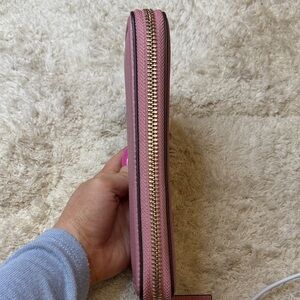 Chic Tory Burch wallet in mauve leather. Features a zip closure and embossed logo. Ideal for daily use.
