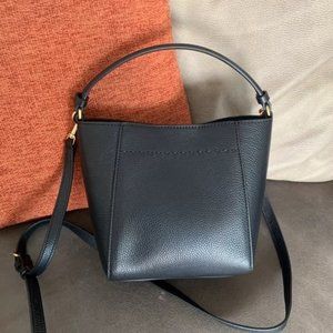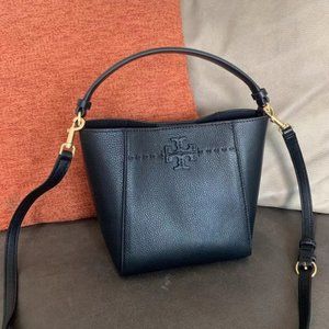 The new McGraw Small Bucket Bag is made of pebbled leather, with a die-cut Double T and pick stitching, sewn by hand. Carry it two ways: by the top handle or crossbody strap.