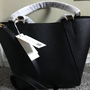 Height: 8.7" (22cm); length: 12” (20cm); depth: 6.3" (16cm) Pebbled leather; suede trim Brass hardware Drawstring and interior bridge with magnetic snap closure; Top handles with 6.1" (15.5cm) drop; adjustable, removable crossbody strap with 21.3" (54cm) drop; 1 interior front slit pocket, 1 interior back slit pocket Dust bag included