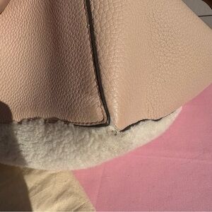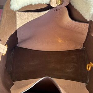 This Tory Burch McGraw Shearling Carryall blends luxe merino lamb shearling with pebbled leather, offering a cozy yet refined silhouette. In a spacious 13” × 11” × 6” design, it features top handles with a 9” drop and a suede-lined interior with two slip pockets—perfect for organizing your essentials. The versatile carryall can be styled tucked or flared for added flair, while top-stitched detailing adds a polished finish. In excellent condition with very minor wear, this bag is ready to elevate your cold-weather wardrobe with cozy-chic appeal. Some minor corner and inside bottom wear as shown in pics.
