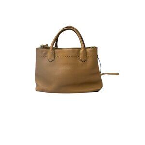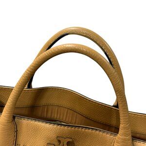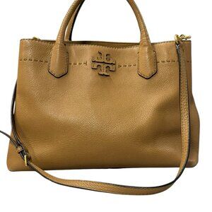 The Tory Burch McGraw Triple Compartment Leather Satchel in Tiramisu is a stylish and versatile handbag perfect for casual or workwear occasions. Made from high-quality leather with a pebbled finish, this medium-sized satchel features a zip, magnetic, and snap closure, as well as double handles in a tan color. The gold hardware adds a touch of elegance, while the interior includes inner pockets and an adjustable strap for added convenience. With the iconic Tory Burch logo and designer theme, this satchel/top handle bag is a timeless and classic accessory for any woman's wardrobe.