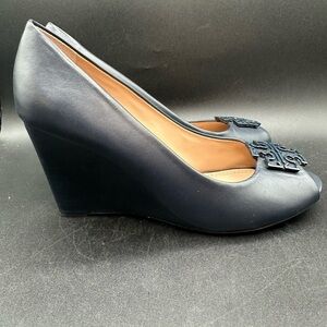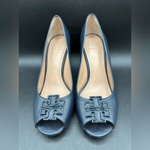 Tory Burch Melinda Peep Toe Wedges Pump Size 8M Navy Blue Leather 3.5" Heel $395