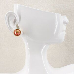 Elevate your look with these stunning Tory Burch earrings. The logo stud dome design exudes sophistication, while the post closure ensures they stay securely in place. Crafted from brass, these earrings are not only stylish but also durable. The round shape and main stone add a touch of elegance to any outfit. Perfect for any occasion, these earrings are a must-have for any jewelry collection. Sculptural logos crown the glossy cabochons rising from gilded stud earrings.