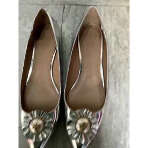 Tory Burch Melody Silver Metallic Leather Sole Pointed Toe Flat Shoes Size 9