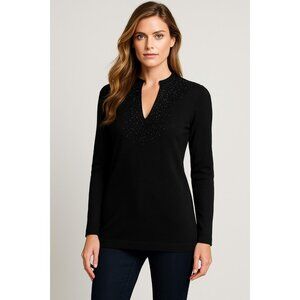 Tory Burch Merino Wool Beaded Tunic Top Black L — Embellished V-Neck Long Sleeve