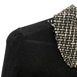 • Features: 100% Merino Wool, Black ribbed knit, Black and white tweed collar and front placket, Partial snap button up closure at front, Long sleeve, Polo style top by Tory Burch