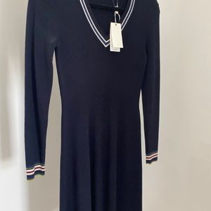 Navy V neck , Royal, white, olive green & red stripes around neck, sleeves & bottom. Slight variation of knit around the waist. Merino wool with 2% elastine for slight stretch.