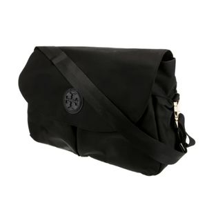 Black nylon Tory Burch messenger diaper bag with gold-tone hardware, leather TB logo, logo jacquard lining, five exterior pockets, four interior pockets, adjustable shoulder strap and snap closure at front.