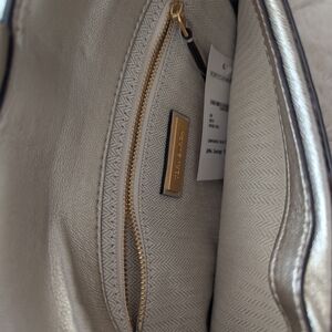 Elegant metallic clutch with signature logo. Perfect for evening events. Sleek and stylish design.