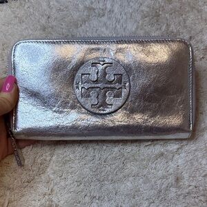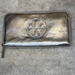 Chic Tory Burch wallet in metallic silver. Features signature logo emblem.