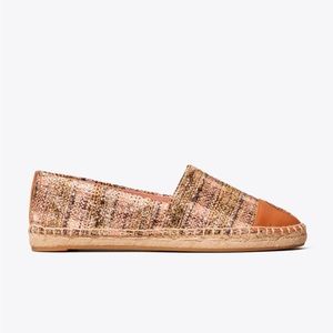 Tory Burch, designer, sophisticate, Iconic double T medallion logo, STRIPED YARN TWEED /NAPPA, metallic tweed espadrille, casual/ formal dress up, vacation, trip, outing, date, brunch, picnic, bbq party, pool party, beach, yacht, boating, holiday vacation, closet staple