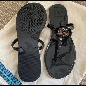 New, worn once. Perfect Tory Burch jelly’s for summer. Size 7. Black with gold detailing.