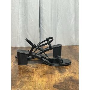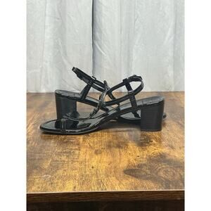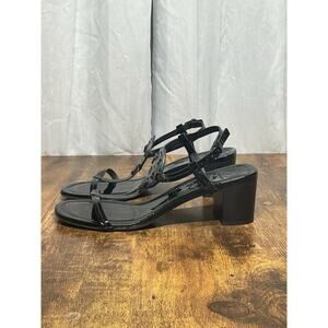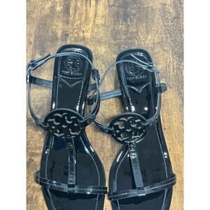 Tory Burch Miller Black Patent Leather T Strap Logo Block Sandals Size 10.5 Heel