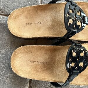 For sale is a pair of Tory Burch Miller Cloud Sandals. Black shiny upper with a cork footbed lined in suede. In next to perfect condition! Worn only 1 time.