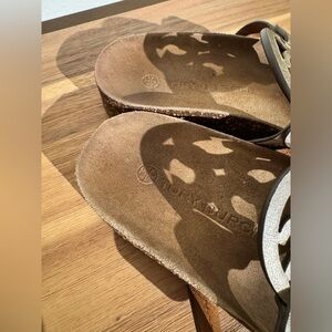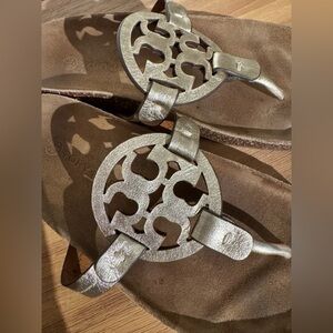 Gorgeous, sold out sandals from Tory Burch - perfect for summer! These are like an elevated Birksenstock. Beautiful leather, metallic upper and a cork leather sole. Some minimal wear, primarily to the footbed, but these look almost new when on. Please review photos! Retail $228 - offers welcome!