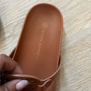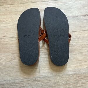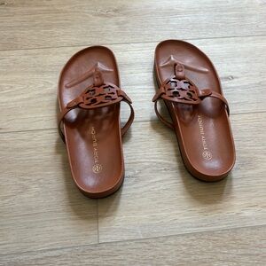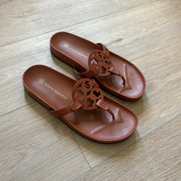Authentic Tory Burch Miller sandals in a classic brown leather. Features the iconic cut-out logo medallion and comfortable slip-on thong style. Timeless, minimalist, and perfect for everyday wear or vacation outfits.