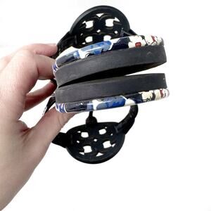 Stand out in these rare Tory Burch Miller sandals, crafted in glossy navy patent leather with a bold red and blue floral “Tea Rose” print. Featuring the brand’s iconic laser-cut logo medallion and a cushioned footbed, these are equal parts comfortable and eye-catching — perfect for warm-weather getaways.