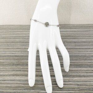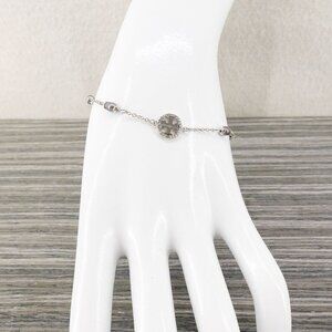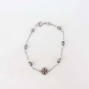 Beautiful, feminine and elegant cultured pearls with pave stone logo bracelet. Delicate chain with silver colored cultured pearls and sparkling pave logo accents.