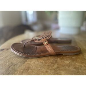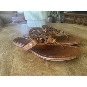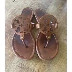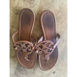 Authentic Tory Burch Miller sandals in smooth brown leather with signature cut-out logo medallion and gold hardware. Handcrafted in Brazil from genuine leather with cushioned footbed and rubber logo sole. These sandals show visible signs of wear consistent with regular use, particularly on the footbed and soles, but remain in good, wearable condition. Timeless and elegant, perfect for everyday wear, vacations, or casual office looks. Please review all photos for condition and sizing details before purchase.