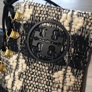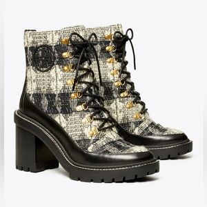 Elevate your style with these designer Tory Burch Miller boots. Made with luxury wool upper material and comfortable block heel, these boots are perfect for any occasion - from workwear to casual outings. The checkered pattern and logo accents add a touch of sophistication, while the lace-up closure ensures a secure fit.