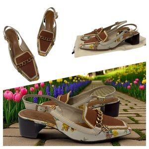Step out in style with these chic floral slingback heels. Featuring a unique chain embellishment, these shoes combine elegance with a touch of flair. Perfect for any occasion. Tory Burch Mini Benton Charm shoes size 6 M pre-owned very good condition