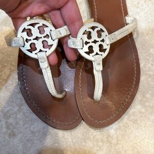 Gently worn Tory Burch Mini Miller Cream Sandals women’s size 9. Cream leather uppers, thong style sandals, mini miller logo emblem on top of foot, leather footbeds, rubber sole. Some light wear on leather otherwise very good condition. Offers accepted!