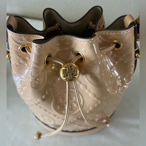 Tory Burch Mini T Monogram Bucket Bag Warm Chai Patent Leather w/Dust Bag