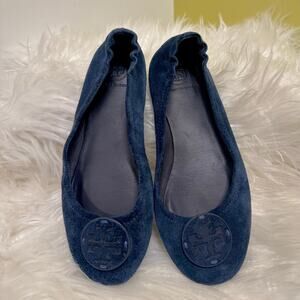 Tory Burch Minnie Travel Ballet Flat Blue Suede Womens Sz 6.5 M Foldable